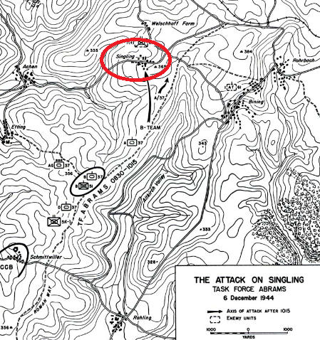 For nearly a month the U.S. 4th Armored Division had been fighting in difficult terrain to clear Lorraine. On December 6th in an attempt to take Bining and Rohrbach and reach the River Sarre and the German border, Lt. Colonel Creighton Abrams’ tank battalion was broken into two combat teams to facilitate its advance. Sweeping north, the lead task force came under heavy direct fire from the direction of Singling. Abrams decided on his own initiative to attack the town and attempt to hold it while the remainder of his force turned toward Bining. . .Attacker: American (Company B, 37th Tank Battalion with elements of 51st Armored Infantry Battalion)