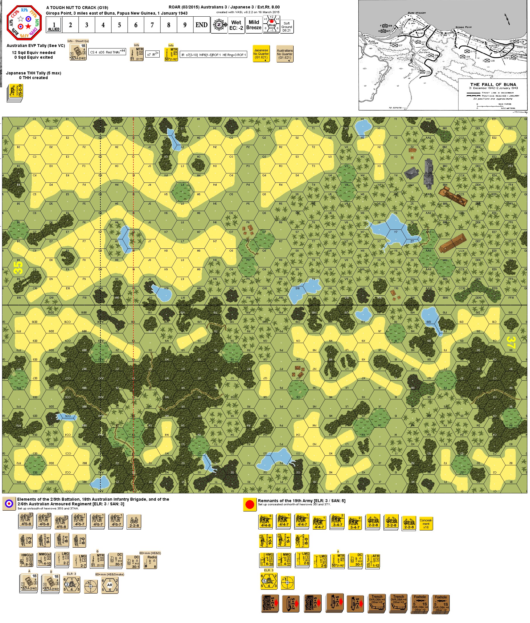 General MacArthur, furious at the perceived inability of his commanders to crack the Japanese fortified positions surrounding Buna, relieved his top field commanders and placed General Eichelberger in command. MacArthur’s last words to Eichelberger were, “Capture Buna or don’t come back alive!” General Wooten, the Australian Area Commander, was awaiting fresh troops from the AIF 18th Brigade and armor support from Milne Bay before resuming the attack on January 1st. Eichelberger, in an attempt at grabbing the glory, threw two companies at the Japanese. They almost immediately stalled and were unable to support the Australian attack scheduled for the next morning.Attacker: Australian (2/9th Battalion, AIF 18th Brigade)