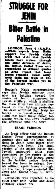 At the end of May, Glubb Pasha had obtained an agreement from the Iraqis which would allow his Arab League to pull out of the Triangle and reinforce their soldiers in and around the Jerusalem Corridor. The Iraqi Army would then enter the Triangle to replace the Arab League. In a failure of intelligence, the Israelis thought that the Iraqis were already in the Triangle and were planning to move south to assist the Arab Legion in an assault against Jerusalem. In order to prevent such a move, the Israelis planned an attack into the Triangle to draw off the Iraqi troops. The main target of the Israeli move was the Arab town of Jenin, situated in a picturesque valley, dominated by ridgelines to the south. Enveloping the city at night, the 21st and 22nd Battalions of the Carmeli Brigade occupied the hills that straddled the main road south of the town. As dawn broke on June 3rd, both sides opened up on each other with everything they had.Attacker: Israeli (21st and 2nd Battalions, Carmeli Brigade and Armored Reserve)