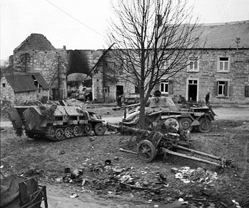 Abandoned German guns, half tracks and Puma armoured car in the village of Foy-Notre-Dame, 29 December