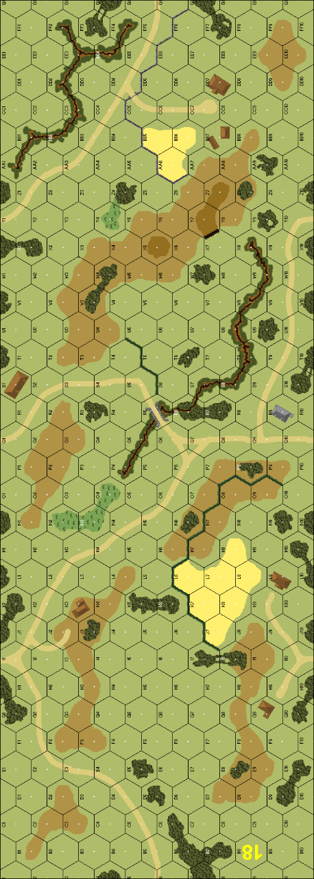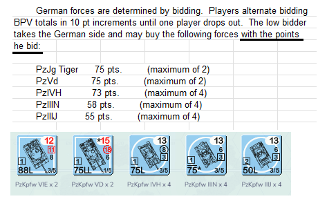 Players Bid for sides. Players alternate bidding BPV totals in 10 pt increments until one player drops out. The low bidder takes the German side and may buy the following forces with the points he bid: PzJg Tiger 75 pts. (maximum of 2).... PzVd 75 pts. (maximum of 2).... PzIVH 73 pts. (maximum of 4).... PzIIIN 58 pts. (maximum of 4).... PzIIIJ 55 pts. (maximum of 4).... Germans also automatically receive a 9-1 armor leader.Attacker: Russian (not disclosed)