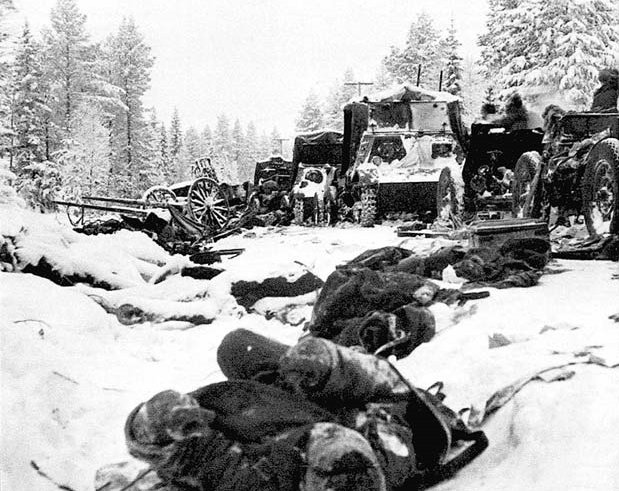 After Russian resistance in and around Suomussalmi collapsed, the dark outlines of enemy soldiers were seen fleeing across Lake Kiantajarvi, back towards Juntusranta. This left the Russian 44th Division stalled along the Raate Road between Raate and Suomussalmi, bogged down and pinned in a 'motti' along the roadside. Col. Hjalmar Siilasvuo acted decisively, dividing up his forces and using them to cut the 44th off from reinforcements. Each section of the Russian column, made up of tanks, guns, men and field kitchens was eliminated by ski troops coming out of the forests in what became known to the Russians as 'belaya smert' or the White Death.Attacker: Finnish (9th Division)