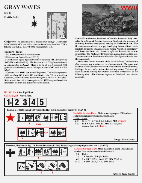 SCENARIO CARD w Map can be found below. . . .After the collapse of Russian forces near Smolensk, the remnants of retreating Russians were spotted heading for the Dniepr River. The German command noticed a gap developing between Soviet units located between the Duna and Dniepr Rivers. With both opportunity and forces available, the chance to split the Russian forces was irresistible. The 7th Panzer Division was ordered to exploit the gap. The train station at Smelva was selected as the objective for the next German assault. Only a few Soviet remnants of the 111th Infantry Division were able to mount any resistance to the German attack.Attacker: German (25th Infantry Regiment., 7th Panzer Div.)