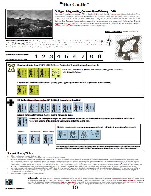 Two American Communications Officer, Major Hallet and Captain Kleinschmidt have fallen into German hands. They have intimate knowledge of the planned radio transmissions scheduled for June, 1944, which will alert the French Resistance to begin actions in support of the Allied Invasion of Europe. The Germans intend to interrogate the two Americans and secure this information. Should Hallet and Kleinschmidt talk, the time-table for the Allied Invasion could be set back several months. Their rescue by a British/American strike-team is imperative. After parachuting into the snow-covered mountains around Werfen, Strike Team Broadsword entered the village of Werfen only to be betrayed by 3 double agents within its ranks. Broadsword’s Leaders Major Smith and Captain Schaeffer managed to escape the Germans and with the help of Mary, entered Schloss Hohenwerfen.Attacker: Allied (Broadsword Strike Team)